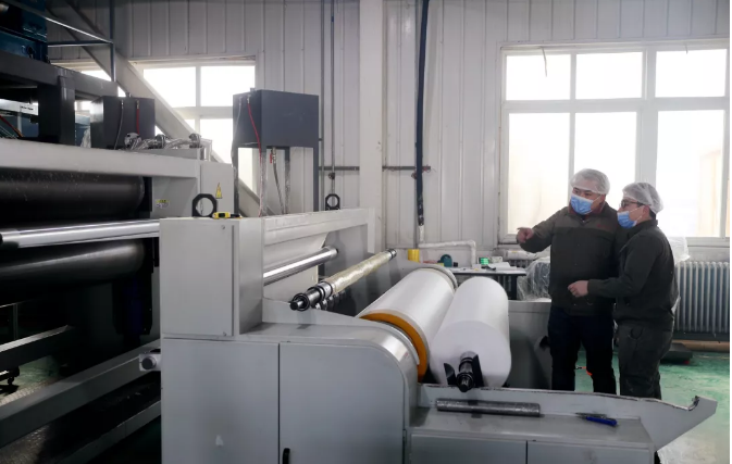 随着疫情防控的发展,口罩物资紧俏,作为上游原材料企业,该企业订单量暴增。为提升改造生产线,区政府紧急协调供电部门在24小时内就加装了一台容量315千伏安的变压器,使得企业可以紧急启用了一条新的生产线,生产实现了高度的自动化。现在一台机器只需要两个工人,两条生产线日产可达4吨产品,可以迅速地发往湖北和河南的口罩生产商。