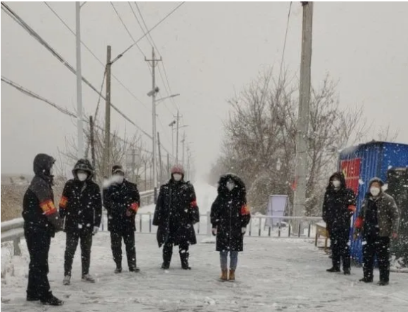 图右三为肖莹雪天在卡口处值班