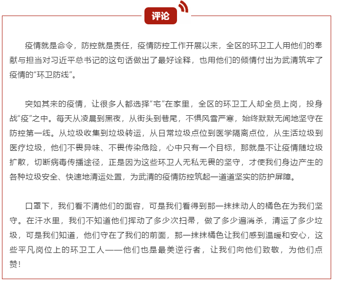疫情就是命令,防控就是责任疫情防控工作开展以来全区的环卫工人用他们的奉献与担当对习近平总书记的这句话做出了最好诠释,也用他们的倾情付出为武清筑牢了疫情的“环卫防线”。