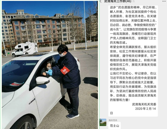 “您好请出示您的出入证。”“请您配合测量体温。”“谢谢您的配合。”这是武清海关二级高级主办范士山在防控疫情岗位上不断重复的话。2月14日武清海关机关党委号召全体党员积极投身社区防控工作,范士山第一个报名,积极投身到尚清湾社区支援防疫工作。年近60岁的他承担起领导临时支援小组的任务,每天和社区志愿者一起奋战在疫情防控最前沿,展现了一名老同志、老党员的担当和表率。