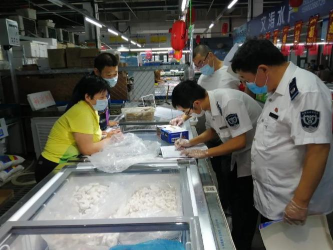 执法人员重点排查了辖区各类经营畜禽肉类及水产品的食用农产品(食品)集中交易市场(含附设冷库)、专业冷冻冷藏库房、超市、便利店、食杂店以及各餐饮服务单位等。