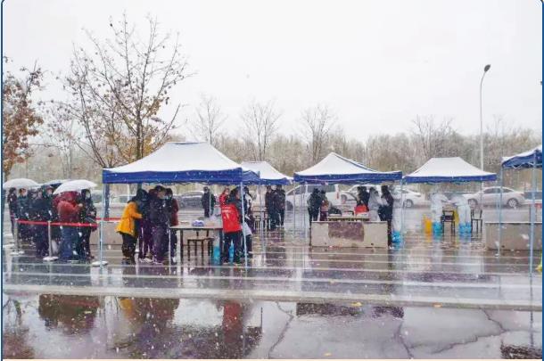 在降温、风雪“齐上线”的情况下,全体工作人员坚守岗位,24小时内安全、高效、快捷完成了采样工作,切实筑牢疫情防控安全防线。